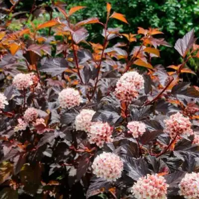 Саженцы пузыреплодника Диабло Д’Ор радуют своей красотой не только листвой: в июне они покрываются щитковидными соцветиями бело-розового оттенка. Эти мелкие цветы, в сочетании с ярко-красными, острыми плодами, создают привлекательный контраст. Листовые вздутия придающие плодам особую округлую форму, добавляют интересный визуальный эффект.