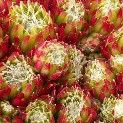 С возрастом растение активно образует потомство, формируя компактные куртины. На 2–3 год жизни центральная розетка цветёт, выбрасывая высокий, до 20 см, цветонос с соцветием из розово-красных звёздчатых цветков. Цветение продолжается 2–3 недели в июле–августе. После этого розетка отмирает, но оставляет много «деток», сохраняя форму посадки.