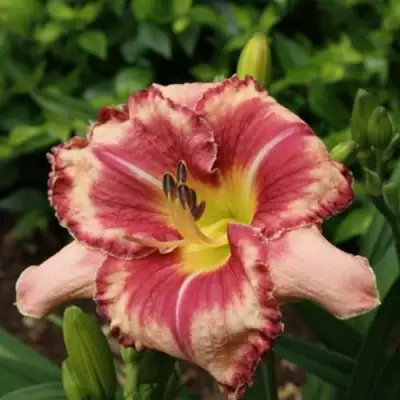 Цветок имеет впечатляющий размер от 12 до 14 см в диаметре и состоит из широких, слегка загнутых вниз лепестков, расположенных в красивых двухъярусных рядах. Удивительное сочетание кремово-розового фона с темно-красным центром и бордовым краем создает эффектный контраст. Сердцевина цветка ярко-желтая, что добавляет нотки свежести и яркости. Аромат цветка является приятным и нежным.