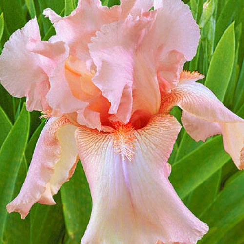 Бородатый ирис Пати Дресс — это не просто садовое украшение, а выразительный цветочный акцент, который играет на грани изящества и сдержанной яркости. Его лепестки окрашены в редкий абрикосово-лососевый тон, который переливается на солнце и подчёркивает глубину цвета фолов. Оттенки будто подсвечены изнутри, создавая эффект мягкой акварели. Этот сорт идеально подходит для тех, кто ценит чистую палитру, текстуру лепестков и устойчивость к климатическим капризам.