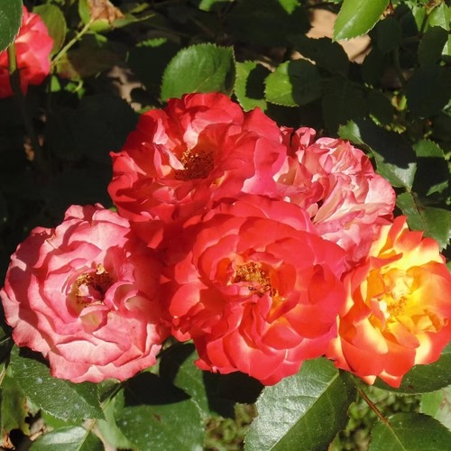 Цветение начинается в июне и продолжается до октября. Бутоны формируются кистями по 5–10 штук, открываются неравномерно, создавая динамичную визуальную массу. Цветки диаметром 5–6 см, густомахровые, с 25–35 лепестками. Оттенок — насыщенный микс оранжевого, малинового, кораллового и абрикосового — меняется в зависимости от фазы цветения и освещения. Каждый цветок уникален. Это даёт кусту живой градиент даже в пределах одного соцветия.